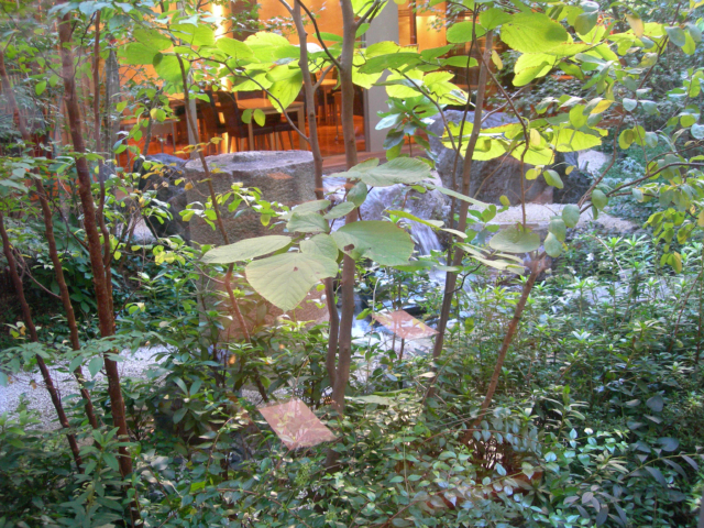 中庭です。面積そのものは小さいですが滝が流れています。雨の日でも楽しめますね。