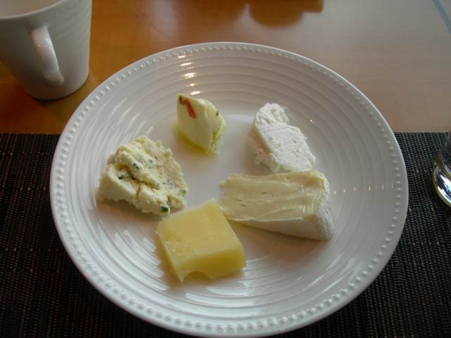 チーズは5種類。モッツァレラチーズ(皿の上中央)は唐辛子入りのオリーブオイルに付けてあり、食べるとピリッときます。酒が欲しい。