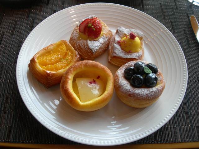 パンはかなり甘いデニッシュをピックアップしてみました。ホットケーキ等も併せて全20種類。量は豊富です。このデニッシュ類はカスタードクリームがぎっしりと詰まっております。