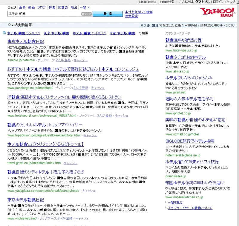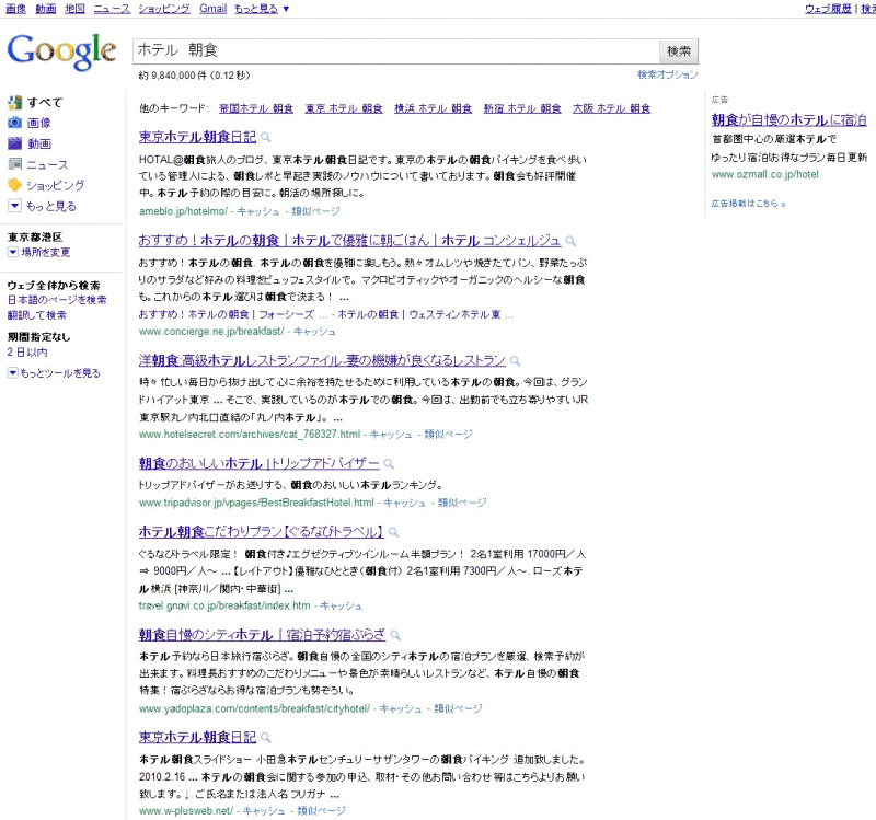 「ホテル 朝食」で検索したところ、yahoo、google両方で順位1位を獲得致しました。